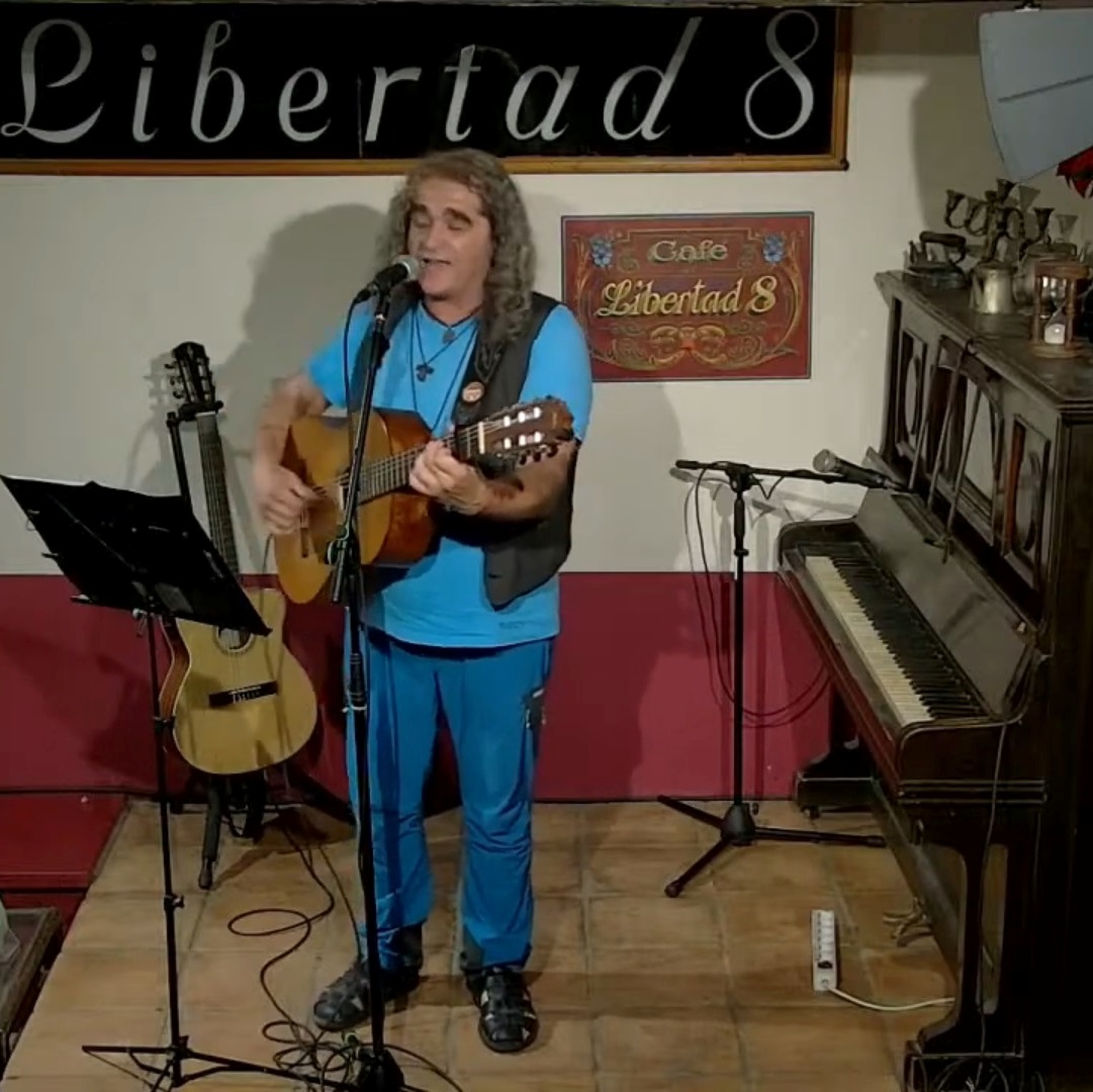 trae solo su guitarra pequeña. Nos canta “Tormenta de kilómetros”, un tema que
